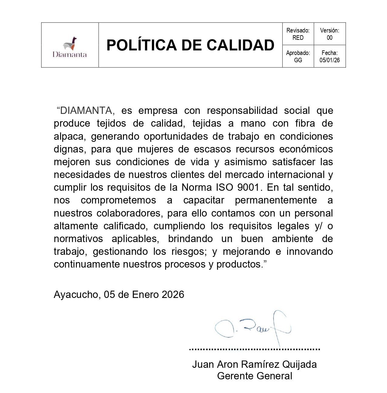Esta política refleja nuestro compromiso con la capacitación permanente, el fortalecimiento de capacidades de nuestros colaboradores, el cumplimiento de los requisitos legales y normativos, la gestión de riesgos, la mejora continua y la innovación constante en nuestros procesos y productos. En Diamanta, la calidad no es solo cumplir una norma: es construir una empresa social sólida, responsable y sostenible, donde la excelencia productiva y el impacto social avanzan juntos hacia un mismo objetivo: transformar vidas con trabajo digno, procesos responsables y desarrollo integral.
